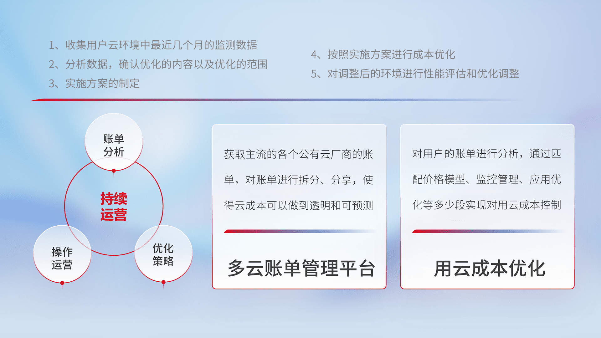 通过多云纳管,,以统一的资源数据模型把客户的云资源进行抽象和封装,,,进而实现对多云资源的统一操作,,保障云资源管理的可靠性、、稳定性与可用性。。。量身定制化运维内容,,,,配置、、、、开发运维、、、补丁管理、、、、备份、、、、监控、、、认证和访问管理、、、、审计和日常巡检等,,,保障在用云过程中的可靠度,,,稳定度以及高可用率。。